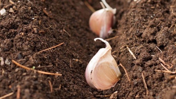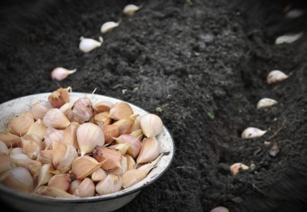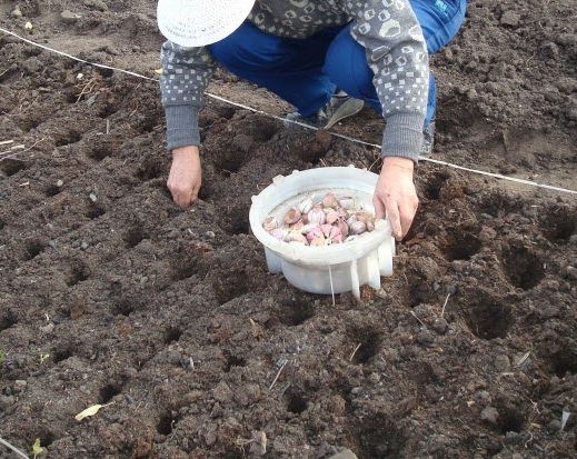 편의상, 밭을 고랑이나 구멍으로 나눌 수 있습니다. 이 고랑이나 구멍의 깊이는 15cm입니다. 겨울 품종을 심을 때는 먼저 배수를 위해 3cm 두께 이하의 강모래를 깔고, 눈이 녹은 후 봄에 작물이 썩는 것을 방지합니다. 그런 다음, 준비된 정향을 최소 10cm 간격으로 심고 흙으로 덮습니다. 밭에는 멀칭을 하는 것이 좋습니다.