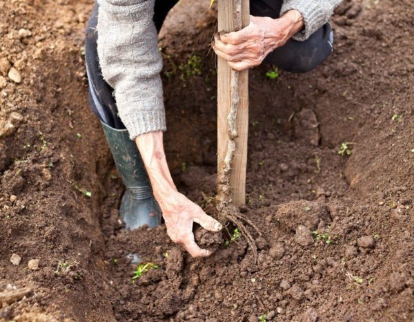 파낸 구덩이 바닥에 말뚝을 박습니다. 이는 가이드를 만드는 데 필요합니다. 다음 단계는 덤불이나 나무의 뿌리를 펴는 것입니다. 그런 다음 영양분 혼합물을 쌓아서 채웁니다.