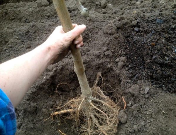 - 나무를 구덩이에 수직으로 내리고 뿌리 시스템을 곧게 펴세요.