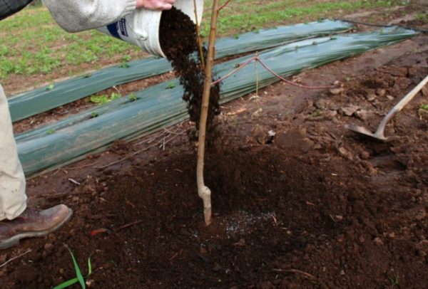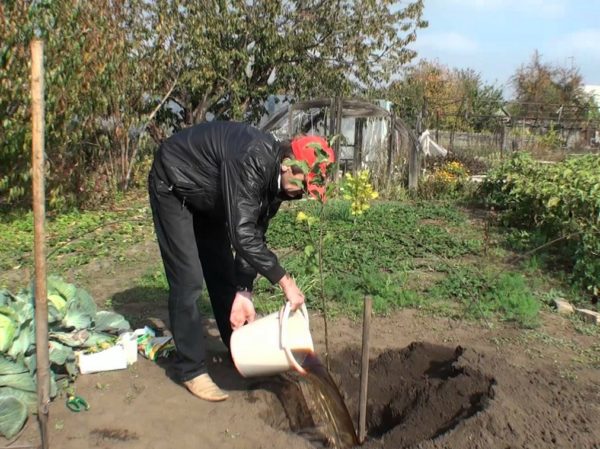 - 묘목 주위에 구멍을 파고, 가장자리에 20cm 두께의 흙을 채우고, 액체를 2~3통 붓습니다.