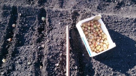 먼저 고랑을 파고 물을 충분히 주세요. 줄 간격은 20cm, 줄 안의 구근 간격은 10~12cm로 합니다. 양파 묘목은 2cm보다 깊이 묻지 마세요. 흙은 가볍게 덮어야 하며, 눌러주는 것은 권장하지 않습니다.