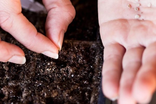 - 묘목 용기를 망간 용액으로 처리하고, 준비된 기질로 채운 다음, 토양 수준이 맨 위 2cm에 도달하지 않도록 가볍게 다진다.