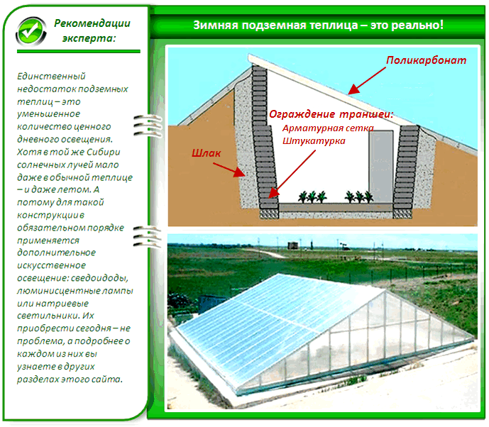 겨울 온실에 가장 적합한 장소는 개간지, 작은 언덕, 그리고 둔덕입니다. 하지만 고지대는 기초를 위한 표면을 평평하게 하기 위해 추가적인 준비가 필요합니다. 저지대는 온실 설치에 매우 바람직하지 않으며, 그러한 구조물 주변에 나무를 심는 것은 심각한 실수입니다.