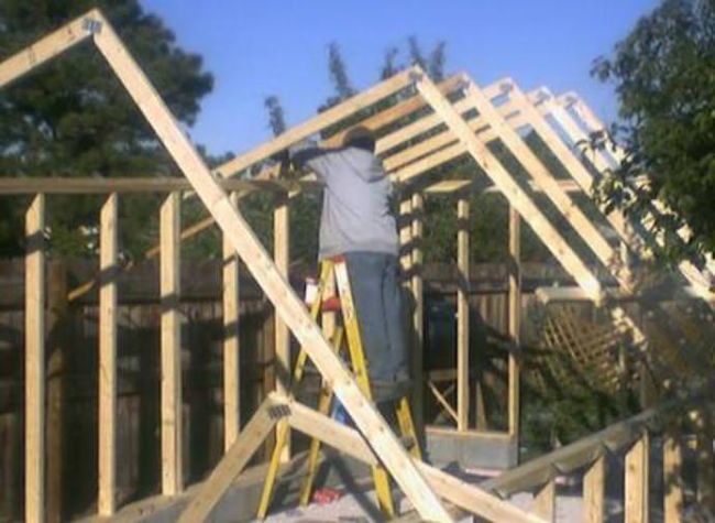타이 빔을 지붕 펠트 위에 설치한 후 타이 래프터를 부착합니다. 지붕 용마루는 타이 빔에 설치합니다. 창문을 통해 물이 스며드는 것을 방지하기 위해 캐노피를 설치합니다.