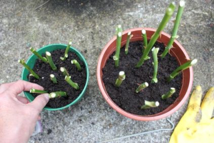 - 각 새싹은 10~15cm 길이의 여러 조각으로 나뉩니다. 각 조각에는 3~4개의 잘 발달된 새싹이 있어야 합니다. 윗부분은 윗눈에서 2~3cm 위까지 직선으로 자르고, 아랫부분은 대각선으로 자릅니다. 잘 날카로워진 도구로 끝부분을 다듬습니다. 시작하기 전에 칼을 에틸 알코올이나 끓는 물로 소독합니다.
