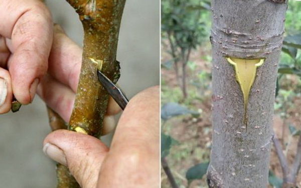 틈 접목법은 일반적으로 두꺼운 가지에 사용됩니다. 특히 두꺼운 가지에는 접수 두 개를 동시에 심는 것이 편리합니다. 가장 큰 차이점은 접수를 심을 대목에 홈을 파는 것입니다. 먼저 접수의 양쪽 끝을 날카롭게 합니다. 틈은 날카로운 칼로 만듭니다. 틈의 깊이는 대목의 지름에 따라 다르지만 일반적으로 2~5cm입니다. 더 쉽게 하려면 쐐기를 틈에 넣을 수 있습니다. 접수의 윗부분을 잘라내고 접목 부위를 단단히 고정합니다. 타르로 노출된 부분을 밀봉합니다.