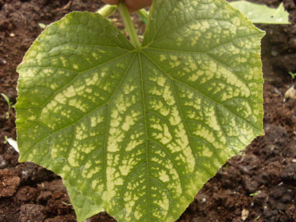 어린 잎에서 가장 쉽게 발견할 수 있습니다. 오이의 윗부분이 더 밝아지고, 작은 잎들은 연한 노란색, 심지어는 옅은 색으로 변하며, 식물의 성장과 꽃 생산이 현저히 느려집니다.