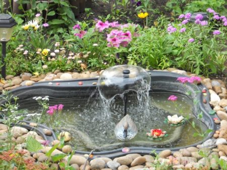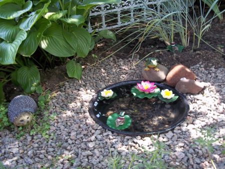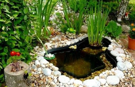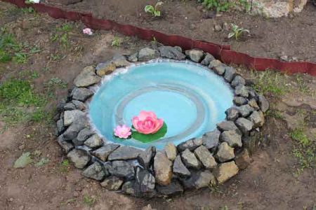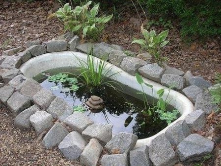 - 미니어처 연못. 이 연못은 조경 디자인의 장식 요소로 사용되며, 욕조, 세면대, 타이어 등 쉽게 구할 수 있는 재료로 쉽게 만들 수 있습니다.