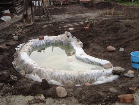 첫 번째 방법은 콘크리트 링을 땅에 묻어 작은 연못을 만드는 것입니다. 다음으로, 링 바닥을 콘크리트로 채운 후 방수 처리를 하거나, 바닥에 폴리에틸렌 필름을 덧대어 마감하는 것입니다.
