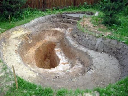 연못의 깊이는 용도에 따라 다릅니다. 장식용 연못의 경우 80~100cm면 충분하며, 비축용 연못의 월동 구덩이는 150~170cm가 적당합니다. 연못 바닥은 넓고 수평으로 계단식 구조로 설계하는 경우가 많습니다. 이를 통해 다양한 깊이의 식물을 재배할 수 있습니다.