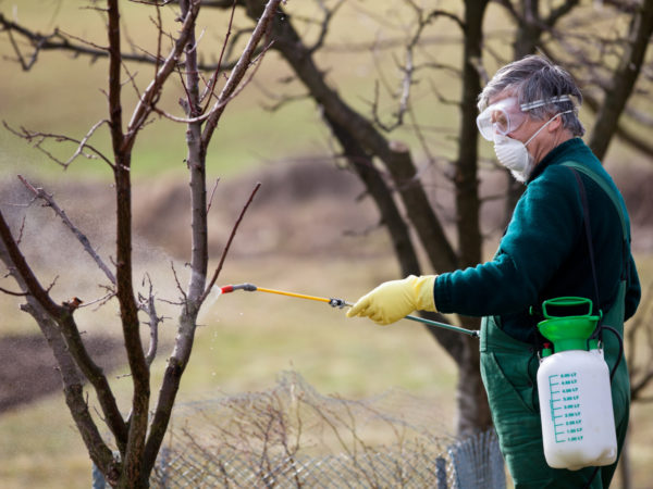때로는 다른 비율이 권장됩니다.황산구리 300g당 황산구리 400g.나무당 적용량은 성분 비율과 무관합니다.이 방법은 초기 싹 부종뿐만 아니라 질병으로부터도 보호합니다.액체가 심기 위로 흘러내리면서 어린 새싹에 떨어져 병원성 균류, 특히 딱지병이 발생하기 어려운 환경이 조성됩니다.식물 보호를 위한 두 번째 처리는 6월 초에 수행할 수 있습니다.그러나 이 경우 보르도 혼합물 농도를 1%로 줄여야 합니다.황산구리를 사용할 때는 안전을 확보하십시오.눈은 고글로, 손은 장갑으로, 호흡기는 마스크나 호흡기로 보호하십시오.보호복을 착용하는 것이 좋습니다.일반 옷에서 혼합물을 씻어내는 것은 사실상 불가능합니다.
