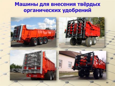 고형비료와 액상비료는 다양한 종류의 기계를 통해 시비됩니다. 고형비료의 경우 ROU-6, PRT-7 등의 장비가 사용됩니다. 액상비료는 MZhT-F-11 및 그 변형 장비를 사용하여 시비합니다.