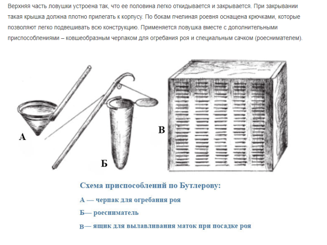 - 떼 포집기(뚜껑이 달린 일종의 그물). 필요한 경우 떼를 포집기에 넣고 앞서 언급한 뚜껑으로 덮습니다. 포집기에 들어간 군집은 A 지점에서 B 지점으로 이동할 수 있습니다.