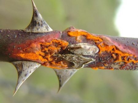 일반적으로 녹병 감염의 첫 징후는 5월 중순경에 덤불에서 나타납니다. 꽃가루를 닮은 밝은 주황색 반점이 줄기에 먼저 나타나고, 나중에는 잎 뒷면에 나타납니다. 이는 에키도스포어(aecidospore) 덩어리로, 8월 말쯤에는 색이 어두워지는데, 이는 곰팡이가 월동을 위한 휴면기에 접어들었음을 나타냅니다.