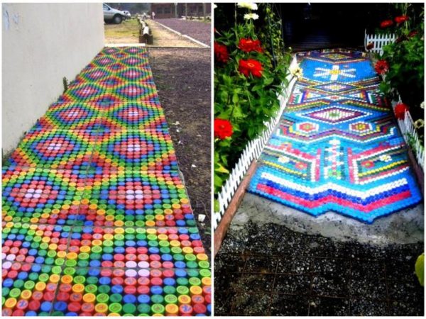 다채로운 플라스틱과 유리 병뚜껑을 사용하여 콘크리트 표면에 아름다운 무늬를 만듭니다. 병뚜껑은 크기와 색상별로 미리 분류되어 있습니다. 원하는 경우 디자인 모티프를 미리 제작할 수 있습니다. 모티프를 만들려면 송곳과 낚싯줄이 필요합니다.