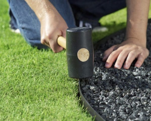 흙을 제거합니다. 도랑의 깊이는 절취선 높이에 10~15cm를 더한 값입니다. 바닥에는 지오텍스타일을 깔고, 그 위에 7~8cm 두께의 쇄석층과 10~15cm 두께의 모래층을 붓습니다. 각 층을 평평하게 다지고 다져줍니다. 절취선을 펼쳐 모래에 눌러줍니다. 틈은 고운 체질재, 모래 또는 잔디 씨앗을 섞은 흙으로 채웁니다.
