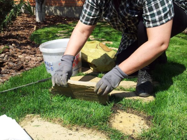 포장은 모르타르, 건식 혼합재 또는 모래를 사용하여 시공합니다. 시공 방법은 포장의 종류와 경로의 용도에 따라 달라집니다. 잔디밭에는 판석 디딤돌이 아주 잘 어울립니다. 이러한 포장에 사용되는 돌은 두께 1~7cm의 돌을 선택하여 4~5cm 간격으로 시공합니다.