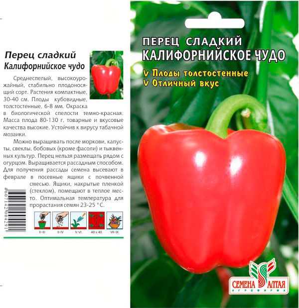 이 고추는 중만생 품종으로, 기술적으로는 120~130일 만에 성숙합니다. 하지만 열매가 완전히 붉게 변하기까지는 20일이 더 걸립니다. 열매 하나의 무게는 80~160g으로 이전 품종에 비해 적습니다. 하지만 키가 70cm에 달하는 표준적인 구조를 가진 이 품종은 소형으로 작기 때문에 수확량이 상당히 높습니다.