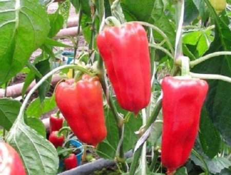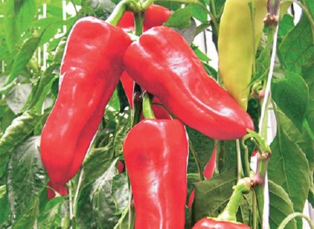 - "울리브카"는 키가 큰 고추로, 한 그루에 최대 27개의 열매를 맺습니다. 고추 한 포기의 무게는 200~250g이며, 길쭉하고 진한 붉은색을 띱니다. 이 고추는 두세 개의 줄기로 나누어 심는 것이 좋습니다. 고추는 균일하게 익어 안정적인 수확을 보장합니다. "울리브카"는 가뭄, 기온 변화, 질병에 매우 강합니다.