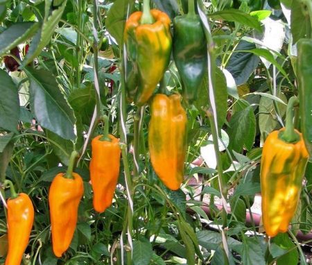 - 열매가 위를 향하는 "자즈나이카(Zaznayka)"는 독특한 하트 모양의 프리즘 모양, 최대 10mm 두께의 벽, 그리고 놀라울 정도로 과즙이 풍부한 맛이 특징인 품종입니다. 열매의 무게는 약 150g이며, 생장 기간은 3개월 남짓입니다. 키가 1m에 달하는 이 고추나무는 반확장성 생장과 반한정성 생장이 특징입니다. 1제곱미터(약 1.2m²)에 네 그루의 나무를 심으면 약 10kg의 수확량을 얻을 수 있습니다. 이 품종은 맛 외에도 꽃이 적게 떨어지고, 저장성이 좋으며, 다양한 병충해에 강하다는 장점이 있습니다.