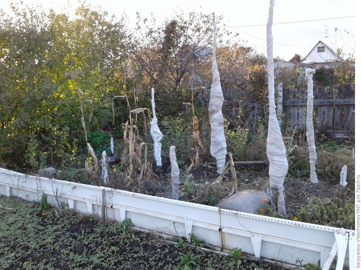 - 줄기는 삼베나 다른 재료로 단열 처리합니다. 동시에 설치류 보호 조치도 취할 수 있습니다. 줄기 주변은 가문비나무 가지로 덮어 뿌리가 얼지 않도록 보호합니다.