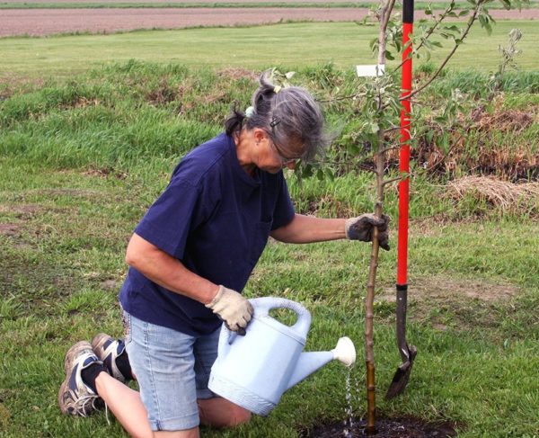 - 어린 나무는 일주일에 두 번 물을 줍니다. 다 자란 나무는 여름에만 물을 주는데, 나무 아래에 물통 두 개를 붓습니다.
