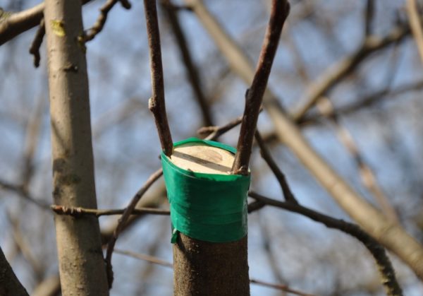 이 과정은 7월 말이나 8월 초에 진행됩니다. 묘목은 조생종에서 만생종으로 접붙입니다. 나무껍질 접붙이기 방법이 간단하기 때문에 널리 사용됩니다. 접수에서 모든 잎을 제거하고 잎자루만 남깁니다. 그런 다음 접수를 대목에 만든 T자 모양의 절개 부위에 넣습니다. 접합부는 비닐 필름이나 테이프로 감쌉니다. 접목 부위의 밀봉을 강화하고 수분 증발을 방지하기 위해 접목 부위에 정원용 역청을 추가로 처리합니다.
