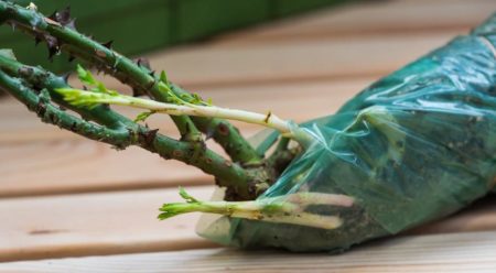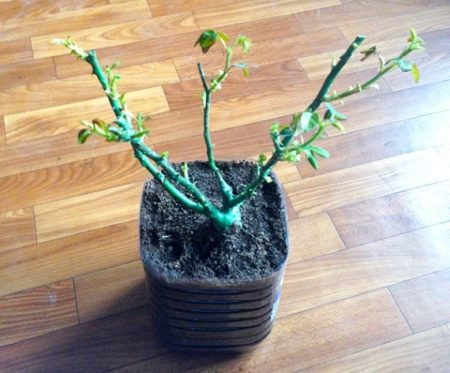 묘목은 겨울에 싹이 트기 시작하는 경우가 많습니다. 상황을 안정시키고 식물이 죽는 것을 방지하려면 적절한 크기의 화분이나 용기에 심어야 합니다. 심기 전에 휴믹산을 첨가한 물에 묘목을 24시간 동안 담가 두십시오. 심을 때는 긴 뿌리를 잘라내십시오. 접목 지점은 토양 높이보다 약간 높게 유지해야 하지만, 너무 낮게 해서는 안 됩니다. 장미 용기 위에 비닐봉지를 덮으십시오. 이렇게 하면 식물이 실내 온도와 주변 환경에 빠르게 적응하는 데 도움이 됩니다. 적절한 습도를 유지하는 것이 중요합니다.