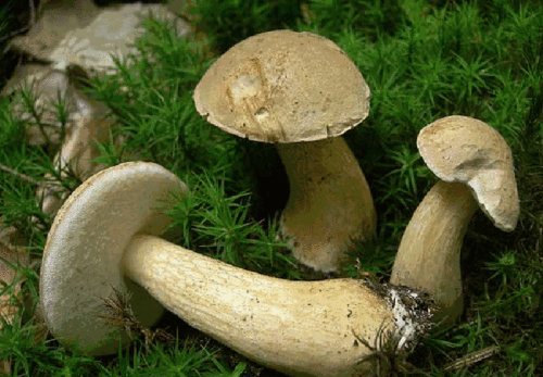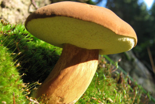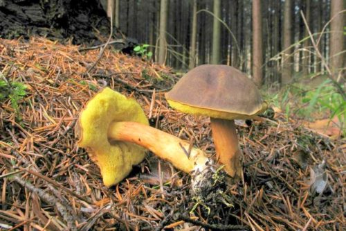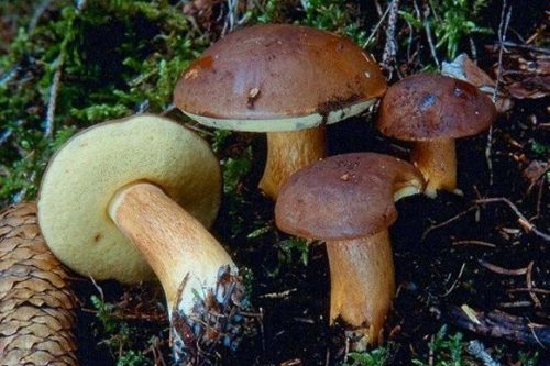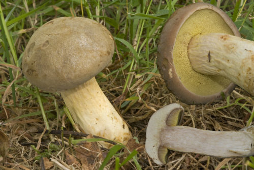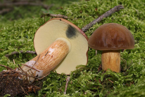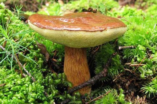 - 얼룩무늬 볼레투스 – 작은 균열이 있는 볼록하고 갈색을 띤 갓이 특징인 식용 버섯입니다. 지름은 12cm에 달합니다. 갓의 아랫부분은 연한 노란색이며, 줄기는 원통형입니다.