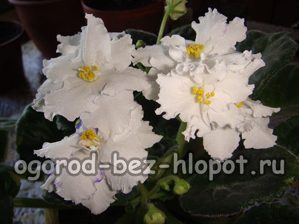- 듀치스 바이올렛은 지름 3cm에 달하는 큰 꽃을 자랑합니다. 꽃은 겹꽃 또는 반겹꽃입니다. 짙은 녹색의 솜털이 있는 잎을 배경으로 블루베리나 라즈베리 같은 큰 반점이 있는 눈처럼 하얀 꽃잎이 피어납니다.