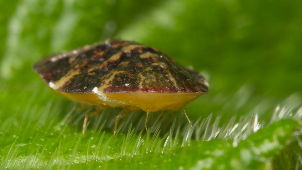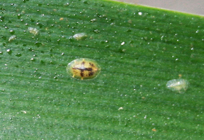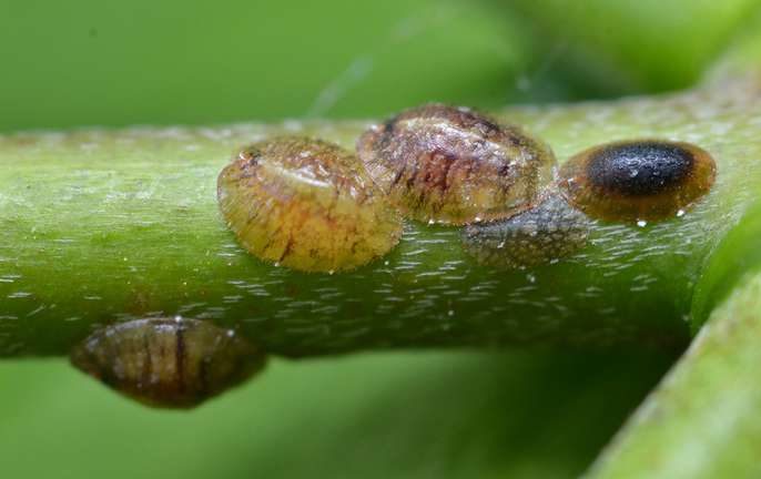 부화 후 몇 시간 이내에 유충은 식물의 즙액을 활발하게 섭취하기 시작하며, 주로 잎 뒷면을 노립니다. 성충은 줄기와 잎에 반점(반점)이 있는 것으로 육안으로 확인할 수 있습니다.
