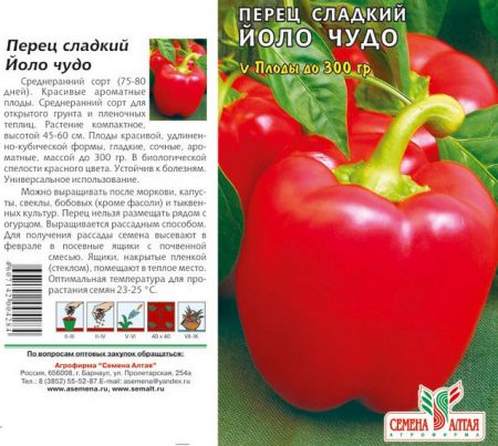 수확량이 높은 중만생 고추 품종입니다. 이 교배종은 러시아 연방 국가 등록부에 중부 및 남부 지역 모두에서 보편적으로 재배할 수 있도록 등재되어 있습니다. 묘목은 왕성하게 자라며 키가 크고 잎이 무성하여 최대 65cm까지 자랍니다. 이 고추는 토양 온도가 급격히 떨어져도 잘 견딥니다.