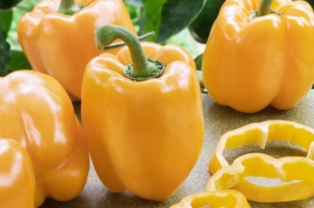 높은 수확량과 다양한 재배법으로 유명한 또 다른 조기 숙성 교배종입니다. 이 중간 크기의 고추는 지상부는 최대 50cm까지 자랄 수 있습니다. 덤불은 촘촘하고 넓게 자랍니다. 잎은 짙은 녹색이며 주름이 있습니다. 원줄기는 튼튼하고 곧으며 고추의 무거운 무게에도 축 처지지 않습니다. 열매는 중간 크기에 완벽한 직육면체 모양이며 황주황색입니다. 실외 재배 시 무게는 150~190g이며, 온실 재배 시에는 최대 270g까지 나갑니다.