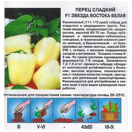 이 조기 숙성 교배종은 완벽한 모양의 정육면체 모양 열매를 맺습니다. 씨앗을 파종하여 생물학적으로 성숙할 때까지 완전히 숙성되는 데 78~80일이 걸립니다. 다 자란 식물은 키가 50~60cm에 이릅니다. 꼬투리는 사면체 모양이며 밑부분이 약간 길쭉합니다. 열매 무게는 350~450g이고, 껍질 두께는 10mm입니다. 맛은 달콤하고 쓴맛은 전혀 없습니다. 이 품종은 통조림이나 생으로 먹기에 적합합니다. 적절한 재배를 통해 이 고추는 풍성하고 꾸준한 수확을 거둘 수 있습니다.