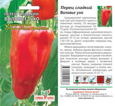 중간 숙성 기간(120~125일)을 가진 또 다른 매우 우수한 품종입니다. 키가 최대 90cm까지 자라며, 가지가 적당히 갈라집니다. "소귀(Ox Ear)"는 모든 악조건에 대한 저항성이 우수합니다. 과실의 저장성이 좋습니다. 고추는 붉고 길쭉한 원뿔 모양이며, 무게는 150~220g입니다. 과육의 두께는 약 6mm이며, 과육은 매우 맛있고 즙이 많으며 향긋합니다. 1제곱미터당 수확량은 약 3kg입니다.