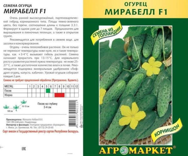 교배종 "미라벨라 f1"은 높은 수확량, 조기 성숙, 그리고 풍미로 인기가 높습니다. 단위결실성 오이 품종으로, 초기 단계는 몬산토 소속 네덜란드 육종가들이 개발했습니다. 온실과 야외 모두에서 잘 자라며, 여러 질병과 악천후에 강합니다. 생과일로 섭취하거나, 테이블 장식, 슬라이스, 간식, 통조림으로 만들어 먹기에 적합합니다.