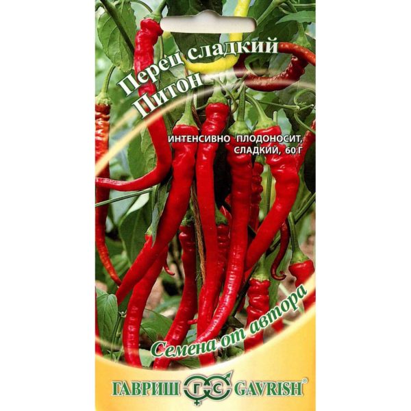 이 품종은 열매뿐만 아니라 관목의 크기도 특이합니다. 식물은 키가 1.5미터에 달하는 경우가 많습니다. 잎은 적당히 많고 관목은 반쯤 퍼집니다. 파이썬은 다른 품종과 달리 열매가 크고, 높이가 27cm, 무게는 최대 80g에 달합니다. 껍질은 얇아 0.3cm에 불과합니다. 파이썬 고추는 정원사들에게 다른 여러 특이한 고추를 떠올리게 하지만, 이 품종은 달콤한 맛과 즙이 많은 과육으로 그 중에서도 단연 돋보입니다. 파이썬 고추는 매끈한 표면 덕분에 윤기 나는 붉은색을 띠며 아름다운 외관을 자랑합니다. 익지 않은 후추 열매는 밝은 녹색을 유지합니다.