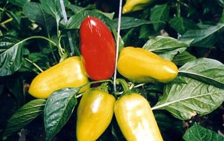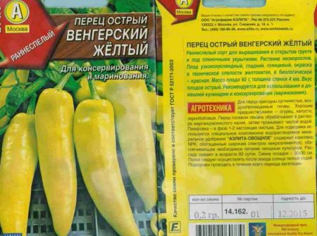 - "헝가리 옐로우" 품종은 품질이 우수한 매운 고추입니다. 키가 작아 발코니 재배에 적합합니다. 상업적으로 성숙하면 무게는 60g에 달하고 껍질 두께는 3~4mm입니다. 익은 열매는 빨간색입니다. 한 그루에서 최대 30개의 고추가 열립니다.