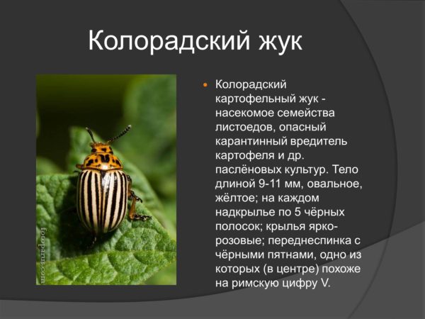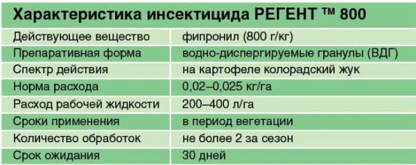 BASF가 각 패키지에 포함한 콜로라도 감자딱정벌레에 대한 Regent 사용 설명서에는 다음과 같은 매개변수가 포함되어 있습니다.
