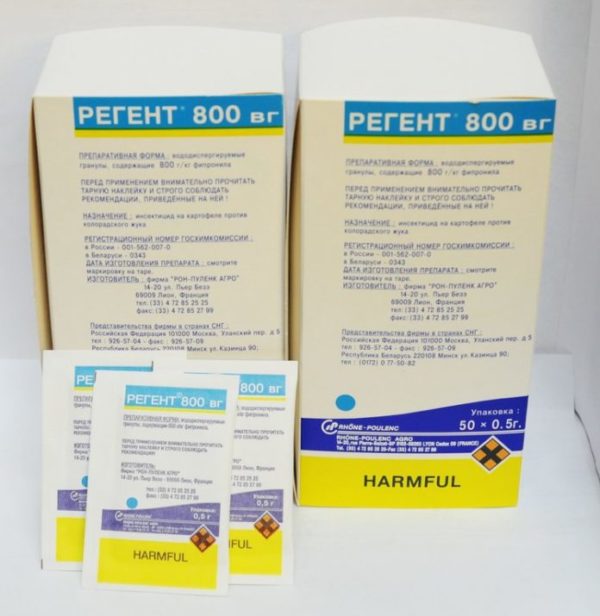 제조업체의 지침에 명시된 대로 리젠트 살충제는 콜로라도 감자 딱정벌레를 포함한 모든 곤충에 효과적이며, 감자 밭에 위험한 이 해충에 대해 이중 작용 메커니즘을 가지고 있습니다.