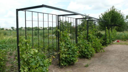 단일 평면 구조의 변형으로 L자형 또는 반 아치형 지지대가 있습니다. 이는 작은 정원에 울타리, 스크린, 작은 반 차양을 설치하여 휴식 공간을 조성하는 데 사용됩니다. 이러한 유형의 지지대는 녹색 성장이 활발한 식물에 적합합니다. 북부 지역에서는 L자형 지지대에 식물을 심으면 잎을 통해 추가적인 태양 복사열을 흡수하는 데 도움이 됩니다.