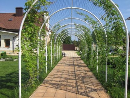 아치형 덩굴 지지대는 정원에 정자, 골목길, 스크린 또는 정원 공간을 만드는 데 사용됩니다. 높이 4~5m에 달하는 키가 큰 품종은 이러한 지지대에서 재배하기에 적합합니다. 아름다운 아치를 만들려면 긴 가지를 구조물의 바깥쪽 가장자리를 따라 배치해야 합니다.