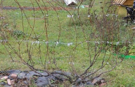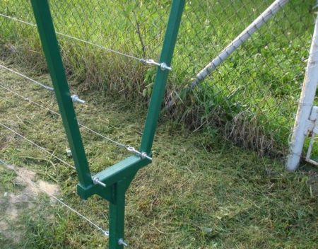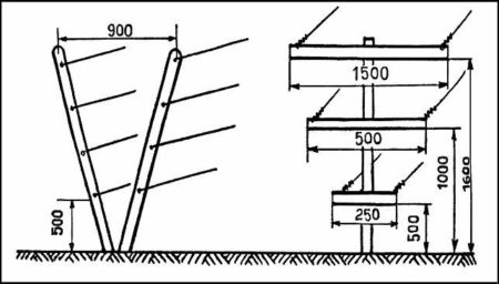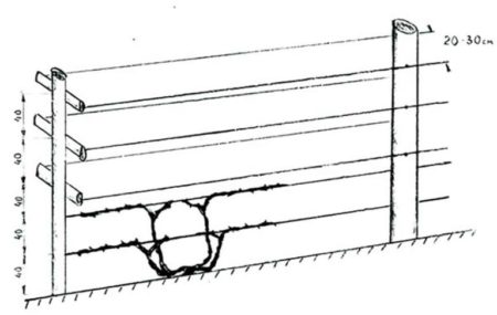 더 복잡한 설계는 두 개의 기둥을 하나의 구멍에 파고 V자 모양으로 비스듬히 설치하는 것입니다. 기둥의 각도를 고정하기 위해 구멍에 콘크리트를 타설합니다. V자 모양 하단 기둥 사이의 간격은 40~50cm, 상단 기둥 사이의 간격은 100~110cm입니다. 기둥의 높이는 180~200cm입니다. 한 줄로 배치된 기둥 쌍 사이의 간격은 5~7m입니다. 기둥 사이에는 50cm 간격으로 직경 3mm의 와이어를 팽팽하게 감아줍니다.