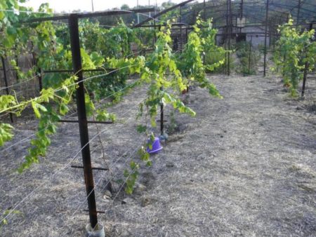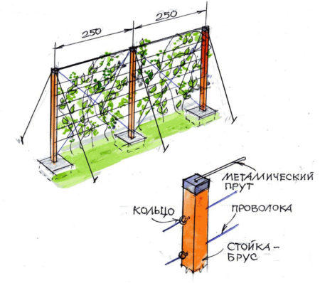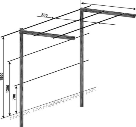 가장 간단한 해결책은 단일 평면 구조입니다. 이를 위해 땅에 기둥을 한 줄 파고 그 사이에 3~4줄의 철사를 엮은 후, 덩굴 가지를 고정합니다. 기둥의 높이는 170~220cm이고, 기둥 사이의 거리는 3~4m입니다. 장력을 위해 지름 3mm의 철사를 사용하여 기둥에 40~50cm 간격으로 고정합니다.