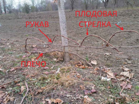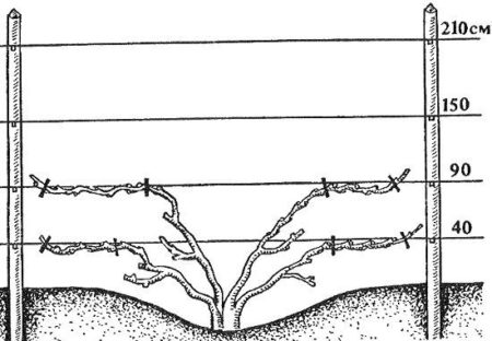 이 방법의 장점은 지지대에 빽빽하게 심는 것입니다. "가지"는 재배자가 봄에 열매를 맺도록 남겨두는 가지입니다. 형태 조정 과정은 매년 봄에 수행됩니다. 생장 첫해에는 근처에서 자라는 튼튼한 가지 몇 쌍을 선택하고 나머지는 가지치기합니다. 각 쌍에서 첫 번째 가지에는 새싹 세 개, 두 번째 가지에는 새싹 아홉 개를 남겨둡니다. 가지 끝부분을 가지치기합니다. 긴 가지는 2년차에 열매를 많이 맺기 시작하고 가을에 가지치기합니다. 2년차 가을에는 짧은 가지에서 가장 강한 새싹 두 개가 발견되고 나머지는 가지치기합니다. 다음으로 형태 조정을 수행하여 한 가지는 열매를 맺도록 하고 다른 한 가지는 교체용으로 남겨둡니다. 매년 비슷한 과정이 수행됩니다.