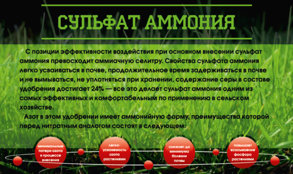 액상 비료를 처음 토양에 시비하고 씨앗을 파종한 후, 황산암모늄은 비옥한 토양층에 오랫동안 남아 있습니다. 이 비료는 토양 내에서 이동성이 낮습니다. 물의 흐름에 영향을 받지 않고, 다른 토양층으로 이동하지 않으며, 비에 씻겨 인접한 화단으로 흘러내리지 않고, 기류에 의해 유실되지 않습니다. 이는 뿌리 체계에 필요한 영양분을 오랫동안 공급합니다.