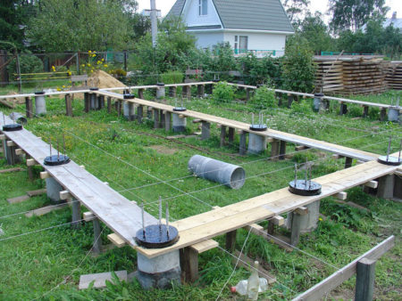 이는 필수 단계입니다. 나사 말뚝은 전체 기초의 움직임을 방지하기 위해 하나의 구조물로 묶어야 합니다. 가장 복잡한 기술은 일체형 쇼링으로, 일반 주택에는 적합하지 않습니다. 목재 또는 금속 격자가 가장 적합합니다.