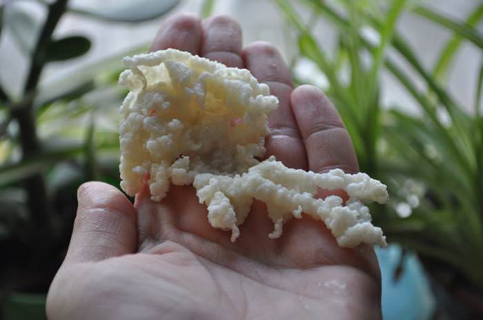 - 발효 과정이 제대로 진행되었다면 24시간 후 우유 표면에 두꺼운 막이 형성됩니다. 이렇게 만들어진 케피어를 체에 걸러내고, 버섯은 나중에 사용하기 위해 따로 보관합니다.