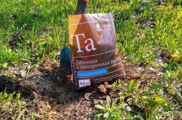 다양한 적용 방법이 있습니다. 오이의 땅 위에 뿌리거나, 흙에 뿌리거나, 담배 가루를 우려낸 물이나 달인 물을 덤불에 뿌리는 것입니다.