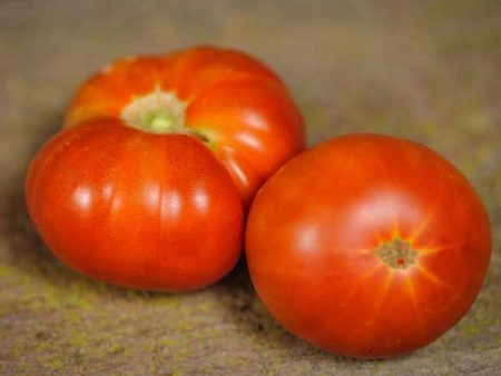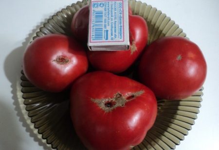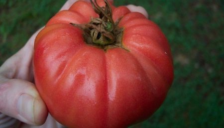 토마토 열매는 납작하고 약간 골이 있습니다. 껍질은 붉은빛이 도는 분홍색이며, 표면은 매끄럽고 윤기가 납니다. 잘 익은 토마토의 무게는 300~700g입니다. 과육은 즙이 많고 육질이 풍부하며 씨가 많습니다.